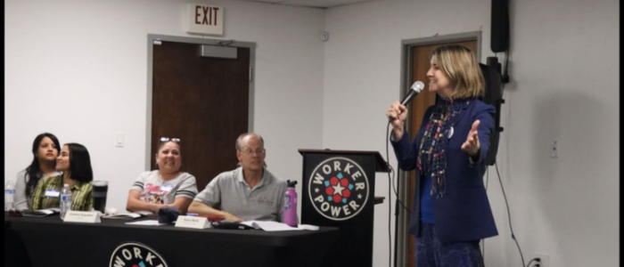 On March 28, 2026, an estimated 8 million people participated in over 3,300 “No Kings” protests across all 50 U.S. states and in several international locations. Local 11 participated in three protests, in AZ, in OC, and in DTLA! In Los Angeles we gathered signatures For the Overpaid CEOs tax, in Phoenix we teamed with Worker Power and asked people to send a letter to ASU asking them not to pay poverty wages to their cafeteria workers, and in Anaheim our Co-President Ada Briceño addressed the protesters while we collected signatures for the billionaire tax petition.
