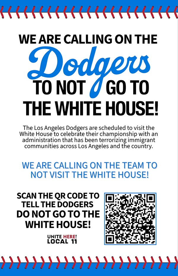 World Series champs, the Los Angeles Dodgers are scheduled to visit the White House to celebrate their victory with an administration that has been terrorizing immigrant communities across Los Angeles and the country. Being a team with several immigrants and that represents a city of immigrants, we’re asking them not to go!