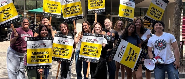 Con los estudiantes regresando al campus de Arizona State University para el semestre de primavera, los trabajadores del servicio alimenticios de Aramark en la universidad realizaron una protesta de bienvenida en Tempe para exigir un contrato justo, niveles de personal adecuados, y respeto en el trabajo. Esta intensificación del conflicto contra Aramark se produjo después de que los trabajadores votaron contundentemente a favor de autorizar una huelga. Con su contrato vencido y las negociaciones en curso, los trabajadores podrían declararse en huelga en cualquier momento si la empresa no llega a un acuerdo justo.