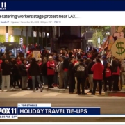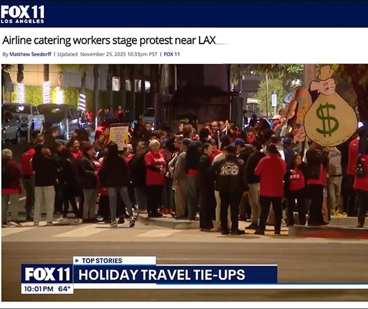 Los trabajadores dijeron que están demandando un contrato nuevo, alegando condiciones de trabajo no seguras, máquinas rotas, puertas cerradas con pestillo creando peligros mortales en incendio, y salarios injustos. SSegún los líderes sindicales que representan a los trabajadores de catering del aeropuerto LAX, esta acción es parte del esfuerzo para “responsabilizar a Flying Food Group”.