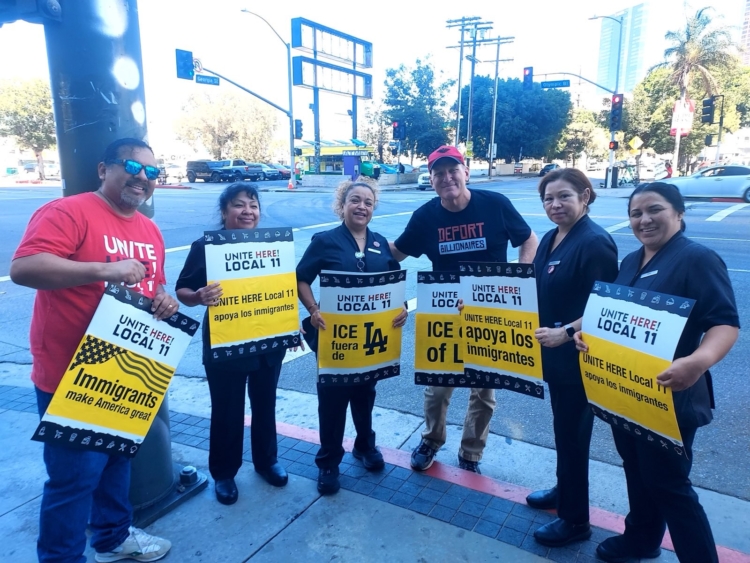 En el Día del trabajador, los miembrtos del Local 1usaron sus descansos del almuerzo no pagados para tomar las calles con un mensaje de solidaridad para todos los trabajadores. Del centro de LA hasta San Pedro y Orange County: ¡ICE FUERA DE LOS ANGELES! Apriete aquí para ver más fotos