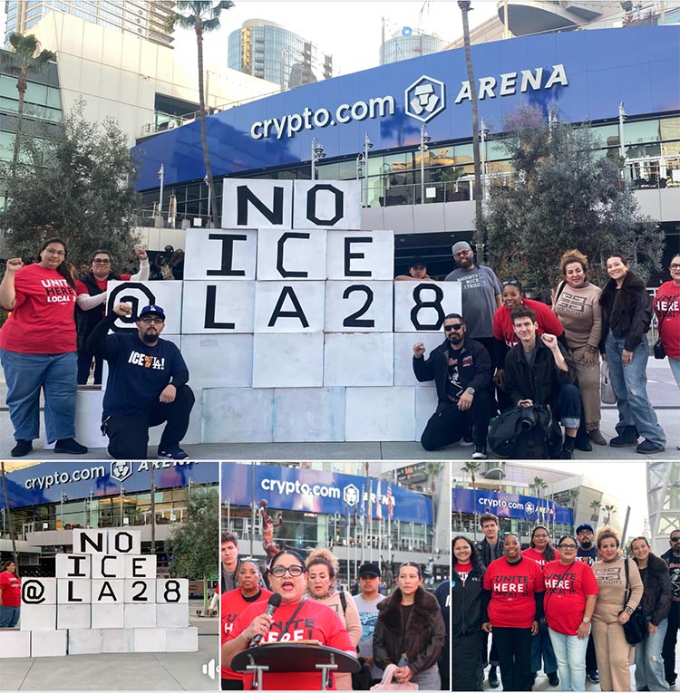 Mientras Los Angeles se prepara para los Juegos Olímpicos de 2028, los trabajadores del Crypto.com Arena tomaron medidas para exigir qwue las instalaciones olímpicas sean seguras y acogedoras, y libres de la represión y los abusos contra inmigrantes que hemos visto en Los AÁngeles y otras ciudades en los últimos meses. Los trabajadores entregaron una petición con cientos de firmas de sus compañeros que insta al Crypto.com Arena a que exija a LA28 y al Comité Olímpico Internacional (IOC por sius siglas en inglés) que se comprometan a mantener al Servicio de Inmigración y Control de Aduanas (ICE) y otras agencias de control migratorio fuera de los eventos olímpicos.