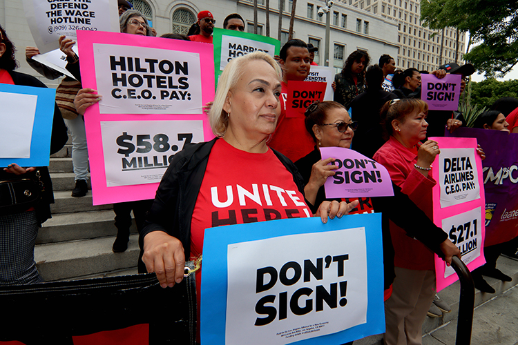 Por más de dos años, los trabajadores del turismo han esto luchando por pasar el Sueldo Olímpico en Los Angeles. Los patrones lanzaron una campaña multimillonaria para revocar la ley, con la financiación tope de las aerolíneas Delta y United, y el Asociación Estadounidense de Hoteles y Hospedaje (American Hotel and Lodging Association). Los representantes de la industria hotelera dijeron a sus miembros que con sólo retrasar la implementación de la ley pueden ahorrar a la industria más de $114 millones, que significa que los CEOs habrán quitado dicha cantidad de dinero a los trabajadores.