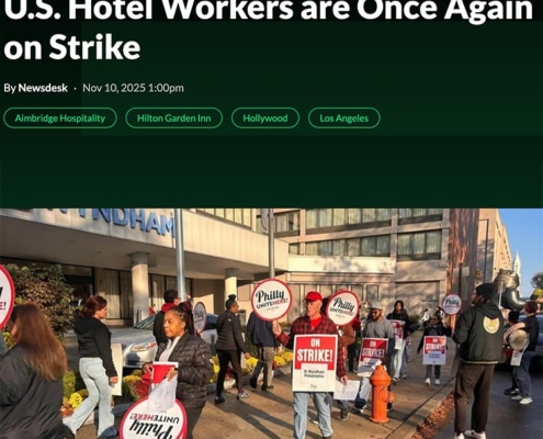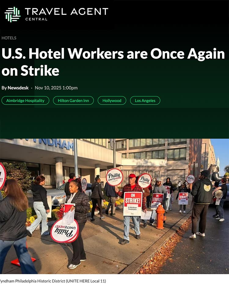 In Philadelphia, workers at the Wyndham Philadelphia Historic District hotel—also owned by RLJ Lodging Trust and operated by Aimbridge—walked off the job earlier today, just ahead of the Thanksgiving travel season.