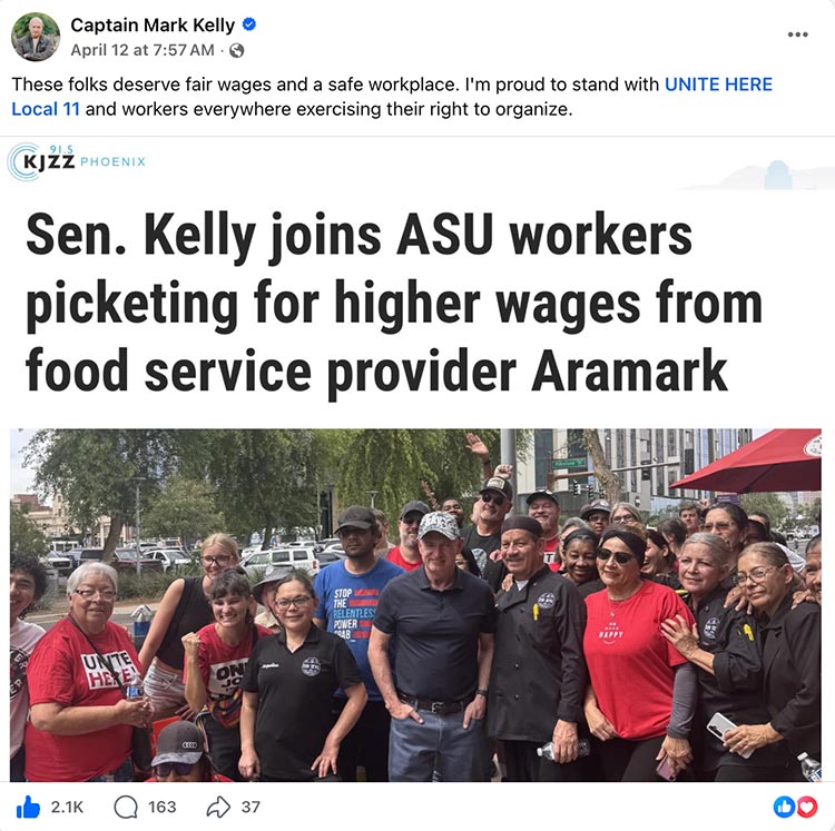 Senator Mark Kelly joined Aramark workers picketing at ASU (Arizona State University) as they continue their fight for a fair contract! ASU dining workers are the cooks, cashiers, dishwashers, baristas, and food service workers who serve thousands of students daily on four campuses across the Valley. Captain Kelly (as he is known in Facebook) then posted his support for the workers on his page! Thank you, Captain!